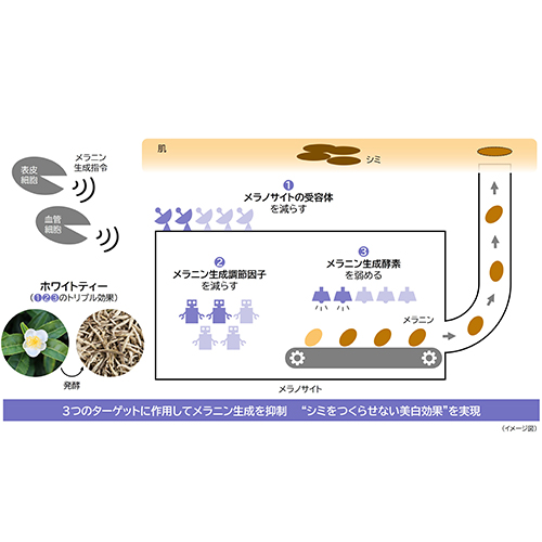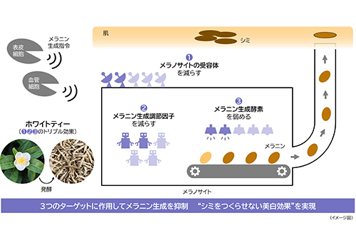 メラニン生成の初期段階に着目し、シミをつくらせない美白効果を実現~「ホワイトティー」が3つのターゲットに作用し、シミ生成を抑制~