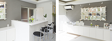 白を基調にした清潔感のあるサロン。中央にあるカウンターから、サロン全体を見渡せるように設計されています。商品は、お花の先生でもあるオーナーのフラワーアレンジメントをプラスしてセンスよく飾られています。