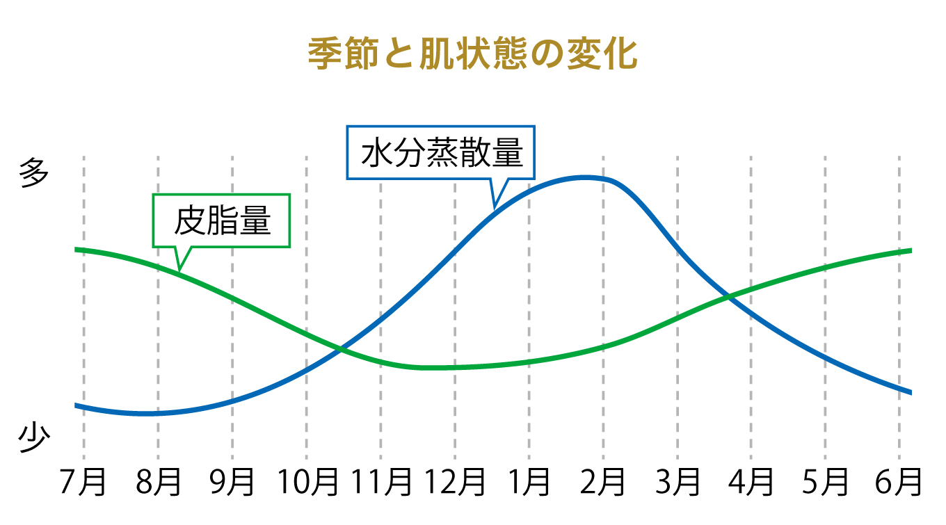 肌のバリア機能が低下する原因は、肌状態のバランスが崩れることに関係しています。肌表面の乾燥を防ぐ皮脂の分泌量は、肌の温度に影響を受けるため、気温が低下する12月には皮脂量が減少し皮脂膜も薄くなります。さらに湿度の低下も加わることで、水分蒸散量が顕著に増え、肌が極度の乾燥を感じ、肌状態のバランスが崩れやすくなります。それにより、バリア機能の低下が引き起こされるのです。